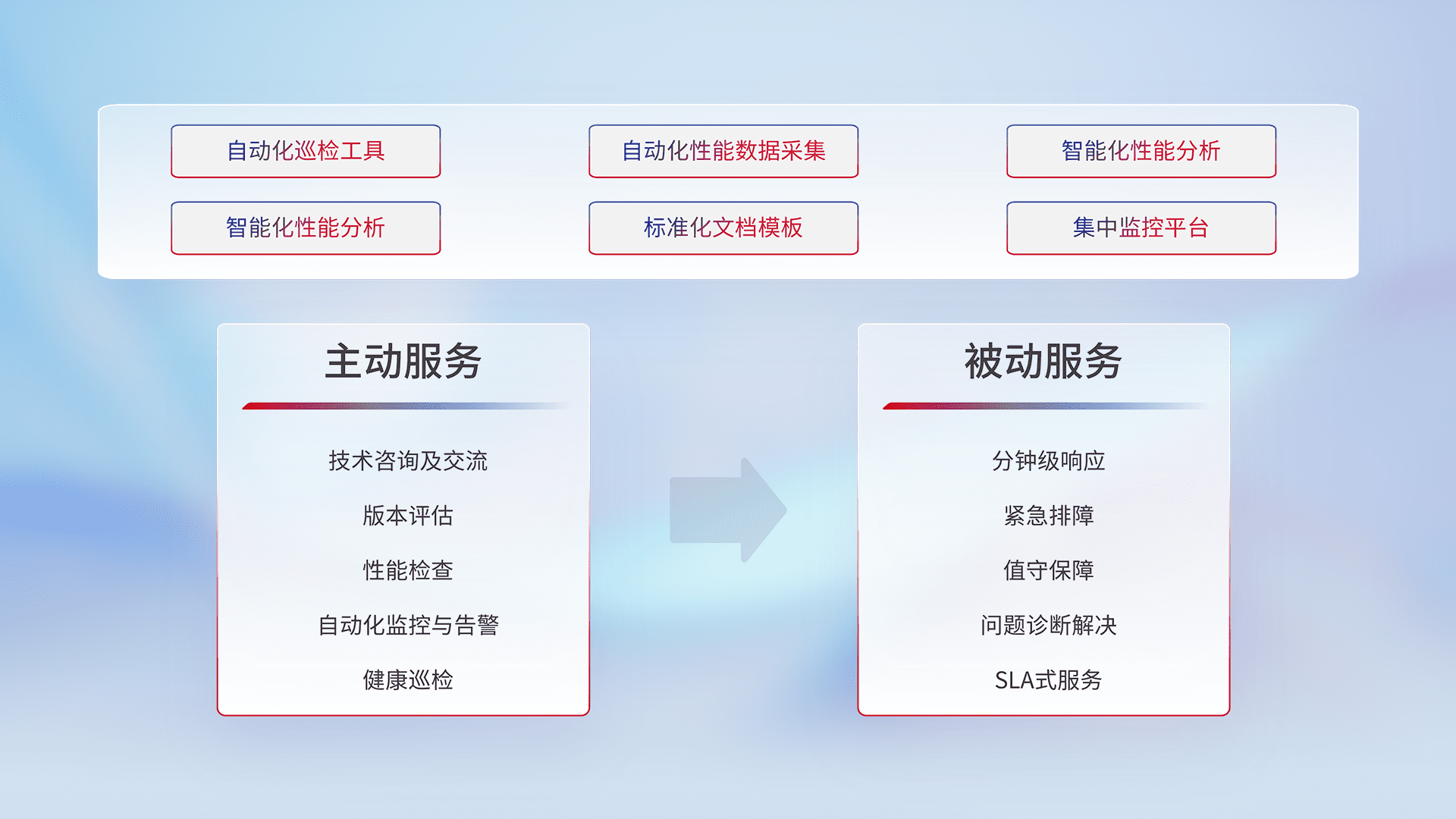 智能化工具和标准化文档,,保障服务质量,,,,提供主动服务(包含技术咨询、、、版本评估、、、、性能检查、、自动化监控与告警、、、、健康巡检)和被动服务包含(分钟级响应、、、紧急排障、、、值守保障、、、、问题诊断解决、、、SLA服务)。。。